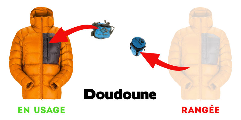 Quelle soit en synthétique (attention au volume plus important, au moindre pouvoir thermique et au poids plus important) ou en duvet (nettement plus compressible, plus léger et plus chaud), la doudoune que nous pensons enfiler une fois arrivé·e·s au camp ou au refuge, nous l'espérons totalement sèche.